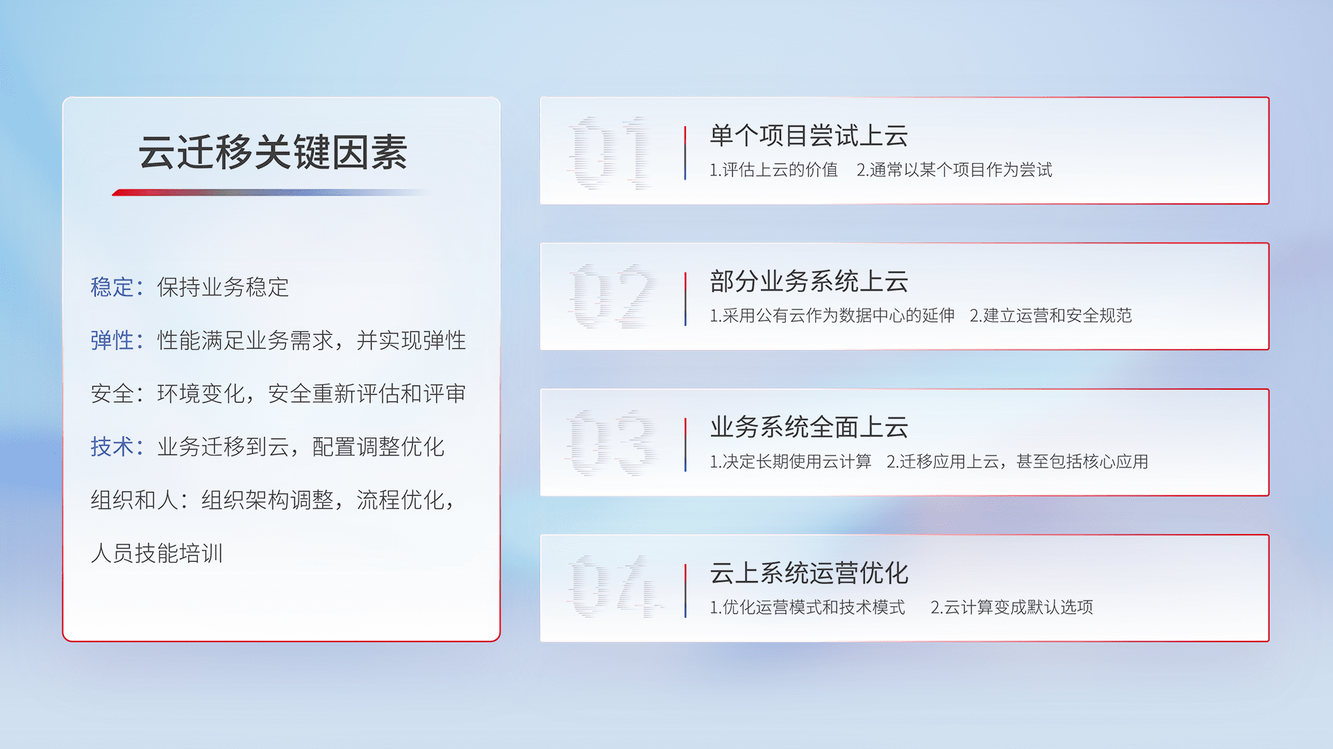 结合实际业务,,,从规划设计、、云平台选型、、、、云原生改造、、、数据迁移、、集成交付,,,迁移全过程为客户识别最佳上云路径,,,做好风险识别管理,,,,设计网络架构、、、、身份权限、、安全审计合规、、操作审计、、日志审计、、、、监控告警策略、、、、多站点容灾设计等,,,对云上基础设施进行整体规划,,提升IT治理水平,,,,以满足弹性、、、高可用、、高性能的需求。。。