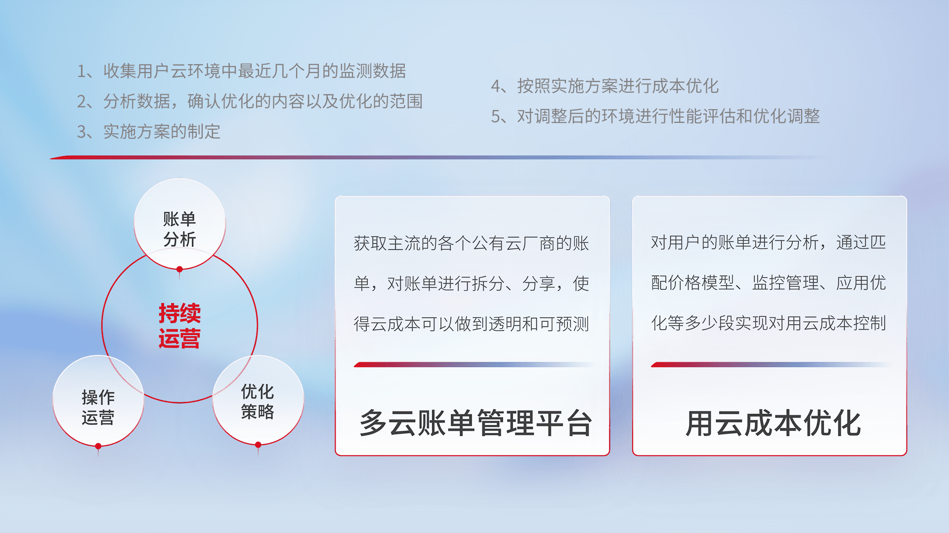 通过多云纳管,,,,以统一的资源数据模型把客户的云资源进行抽象和封装,,,进而实现对多云资源的统一操作,,,保障云资源管理的可靠性、、、、稳定性与可用性。。量身定制化运维内容,,,配置、、开发运维、、补丁管理、、备份、、、监控、、认证和访问管理、、、、审计和日常巡检等,,保障在用云过程中的可靠度,,,稳定度以及高可用率。。。。