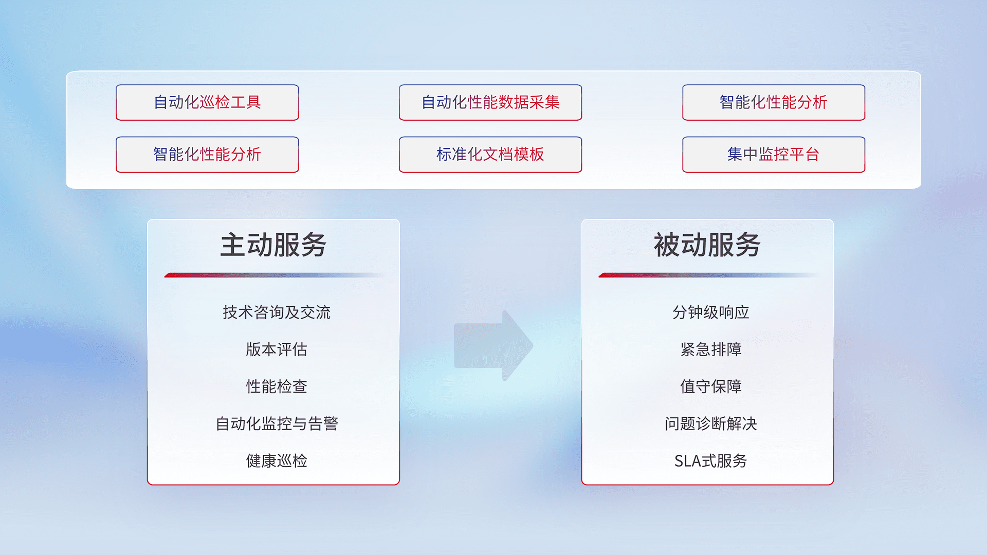 智能化工具和标准化文档,,,保障服务质量,,,提供主动服务(包含技术咨询、、版本评估、、性能检查、、、、自动化监控与告警、、健康巡检)和被动服务包含(分钟级响应、、紧急排障、、、值守保障、、、、问题诊断解决、、SLA服务)。。。。